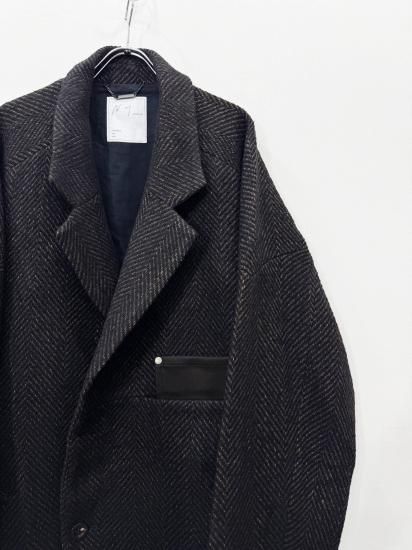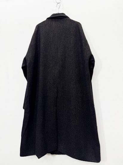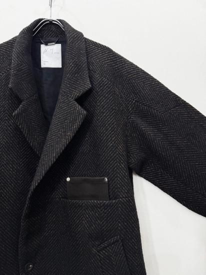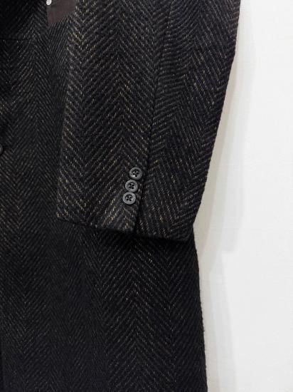 ウールを主体にナイロンとレーヨン、3種の素材を合わせた杢感の強いヘリンボーンデザインのロングコート。