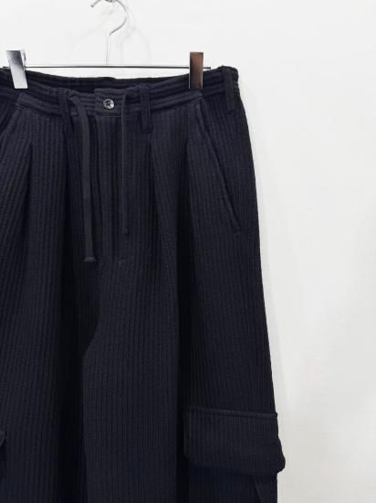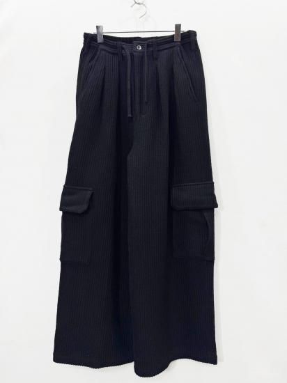 ウール×コットンを掛け合わせコーデュロイの強い畝を立たせながら編み上げた素材を使用したワイドカーゴパンツ。